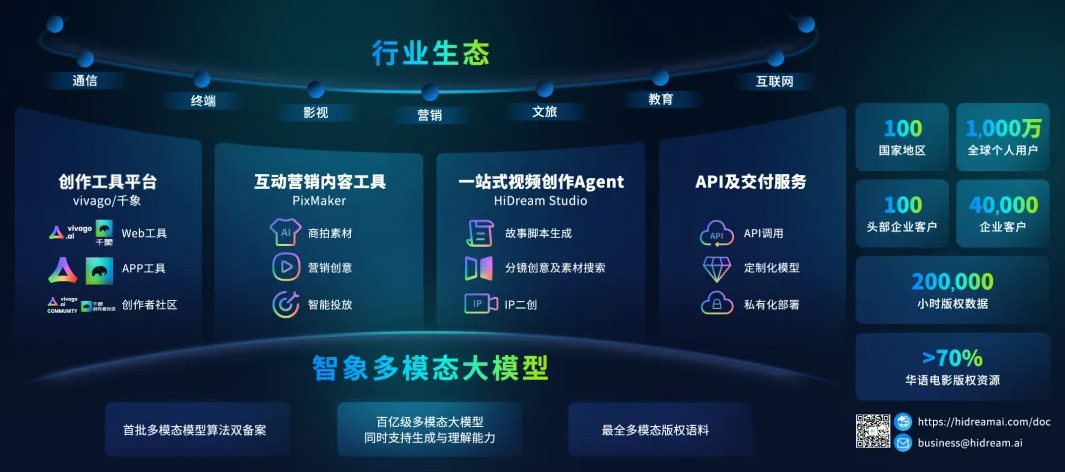 智象多模态大模型是智象未来(HiDream.ai)自主研发的大模型,是全球首个上线开放使用的图像和视频生成Diffusion Transformer (DiT)架构模型,模型参数规模已超过百亿,实现了对文本、图像、视频、3D 的联合建模,能够契合多行业场景中的能力需求,并已通过模型和算法双备案。基于智象大模型”构建的“智象 AI”系列产品,已实现了图像生成编辑、4K高清画面、全局/局部可控、剧本多镜头视频生成等功能,在AIGC技术和数字创意领域商业化等方面具备领先优势。